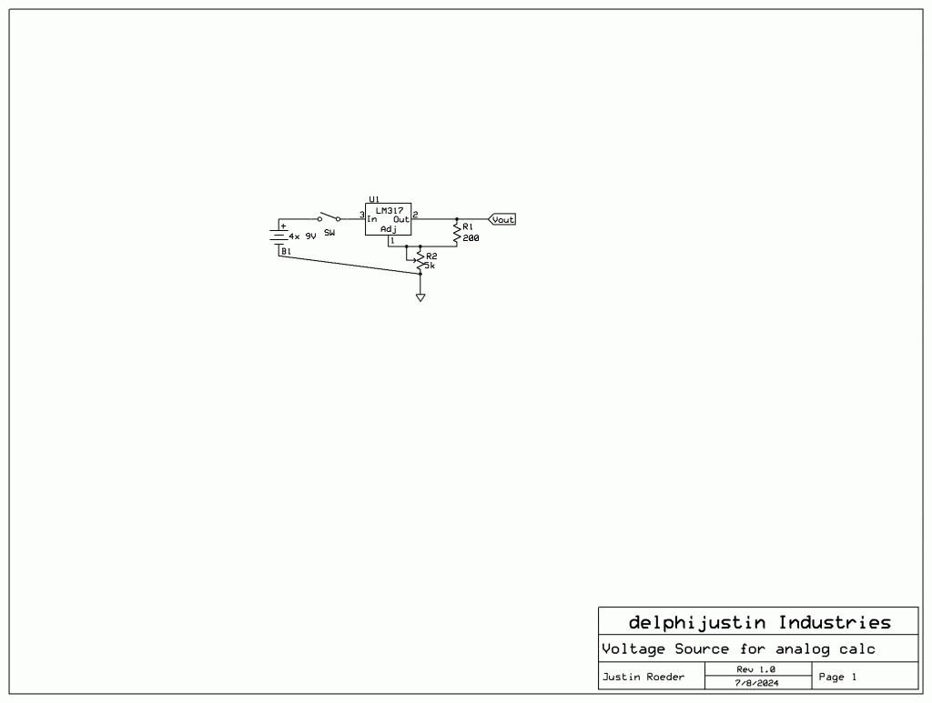 Here it is. This will give the numerator any number between 1.25 to 32.5. I plan on powering it from 4x 9v batteries. This will provide 36vdc of power. You can use anything from 40v or less. If anything higher is needed you can build a rectifier diode chain, I’m not sure if it’s accuracy is any good. Any adjustable linear voltage regulator is good for this purpose To change the voltage range on the LM317 click here.