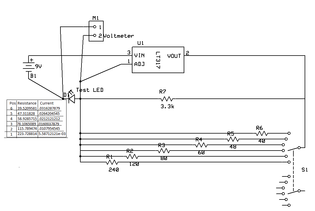 Here’s a simple LED tester that allows you to test LEDs, see how bright they are and let’s you see the forward voltage drop used to figure out the current limiting resistor. We use a 100mA LM317 current regulator. By doing this you can see how the LED reacts to different currents. In this circuit it uses a 6 position switch to choose the current(between 5mA to 30mA). D1 is the LED under test, M1 is a voltmeter measuring the forward voltage across it. R1-R6 are the resistors used to choose the current. No power switch is needed even if powered by a 9V battery, when the LED is hooked up no current flows. R7 shunts the regulator when the switch becomes open during changing current so that the current does not go sky high. It might be cheaper to buy 21 resistors and use them in parallel as need.