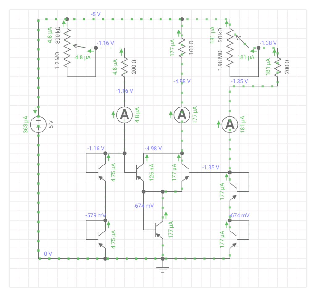 Here’s a circuit that Joerg from the electronics chat shared with me. The circuit outputs a current and inputs a current for the variables in the Pythagorean equation. Pythagorean theorem solves for the hypotenuse of a triangle. The currents in the circuit are the same way