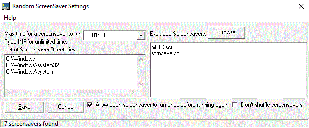 This screensaver randomly chooses screensavers when it starts. You can choose which folders to use, how long of a delay between screensavers and which ones you don’t want running.