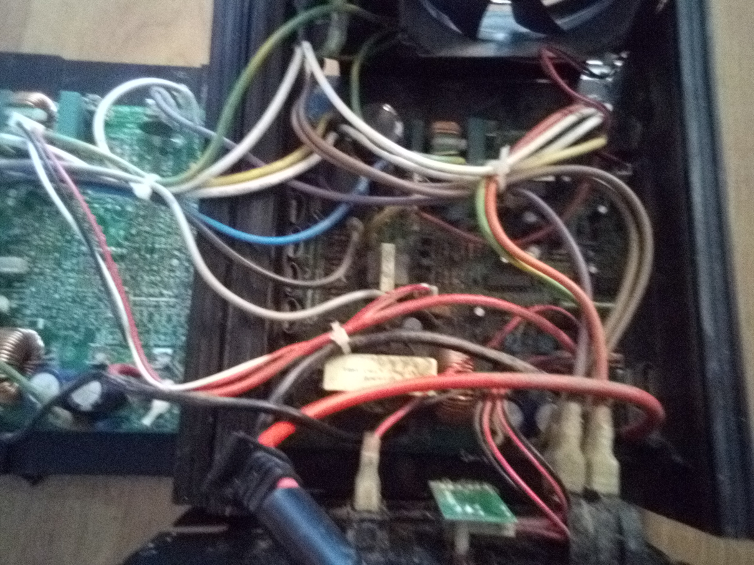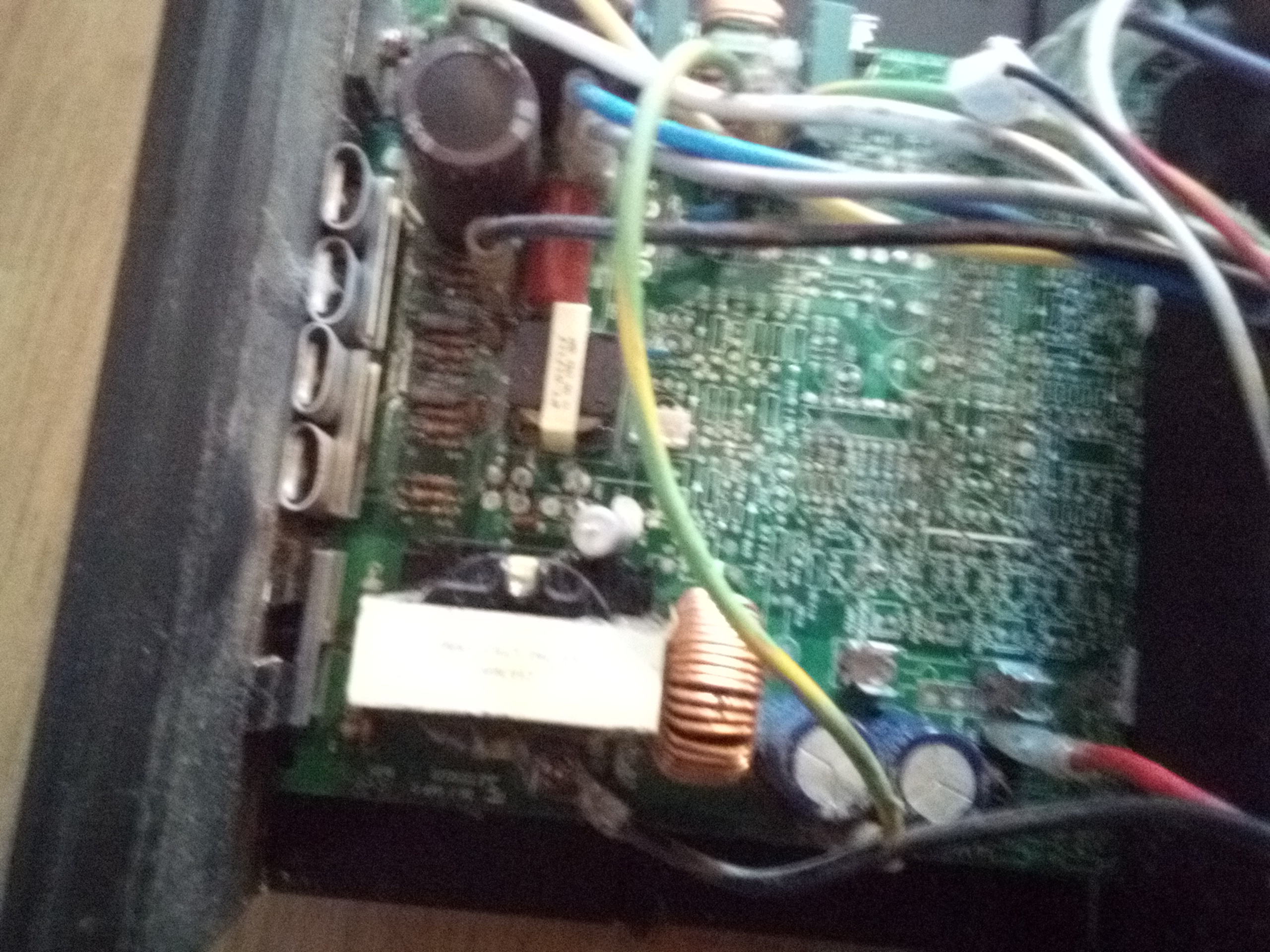 I believe that one of the two capacitors has leaked(because of the brown marks right by the vented Capacitor in the top board. The capacitors are 1000uf 50v