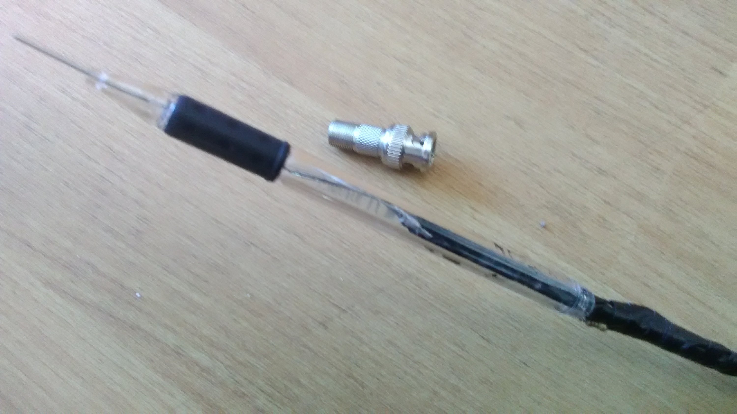 In this blog post I will show you how to build a x1 probe and a x10 probe. You will need resistors, a pen(prefer one with the tip can come off),6ft or less of TV coax, paper clip,one alligator clip, 1 Meg impedance oscilloscope and a f jack to BNC adapter. You will want to get the lowest wattage resistors. This is so that it can be easier to put the resistors inside of the pen. The resistor closest to the tip is should be 5 Meg, and the one that connects to center and ground is 1.25 Meg. When connected to the 1 Meg oscilloscope it makes a divide by 10. And that is how this times ten probe works! The times one is the simplest, you just hook tip and ground directly to the oscilloscope. Also you want the lowest amount of wire exposed. In the picture of the oscilloscope shows 10.11vdc being measured on 1v/div. It definitely reads approximately 1v. You might be asking why use F-jack coax? Here’s what it says on Wikipedia about it: