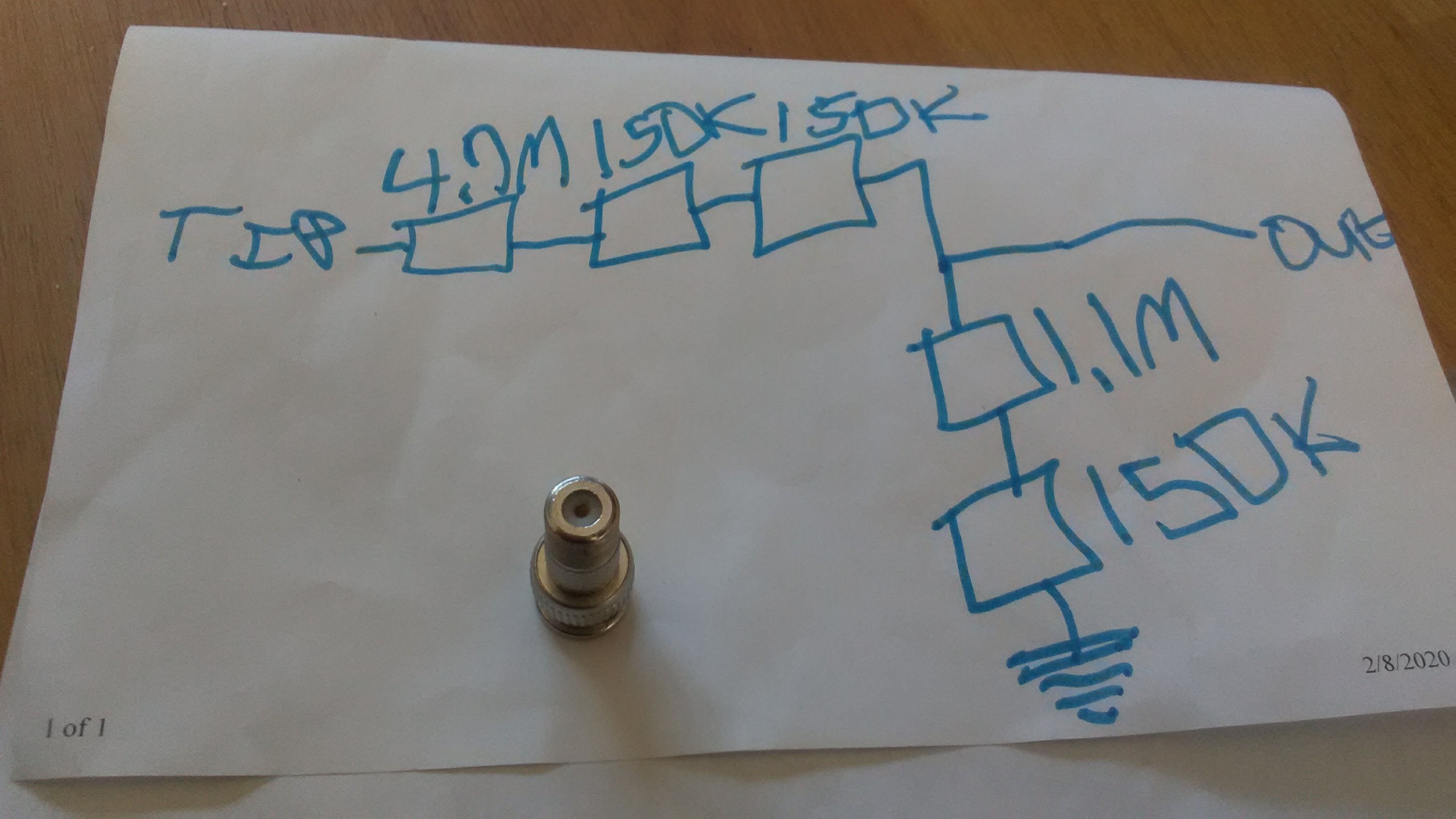 - Next solder the 1.1Meg resistor to the 150k resistor from step 3 to the center pin. Again make sure to use short connections as possible.